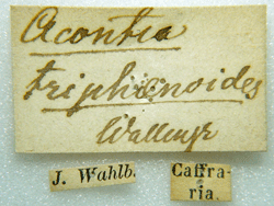 ![]() Acontia tryphaenoides Wallengren, 1856. Reference: Wallengren, H.D.J. 1856, Anteckningar i Zoologien. I. Kafferlandets Macrolepidopter-Fauna. - Akademisk Afhandling, Berlingska Boktryckeriet, Lund. 97 pp. Return to species-list. |
