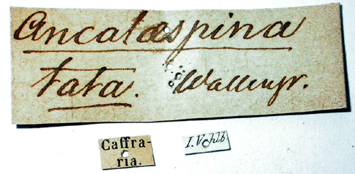 ![]() Ancalaespina tata Wallengren, 1860. Reference: Wallengren, H.D.J. 1860, Lepidopterologische Mittheilungen. - Wiener Entomologische Monatschrift Band IV Nr. 6, Karl Ueberreuter, Alservorstadt. pp 161-176. Return to species-list. |