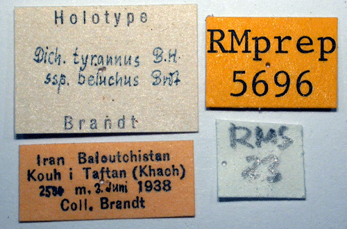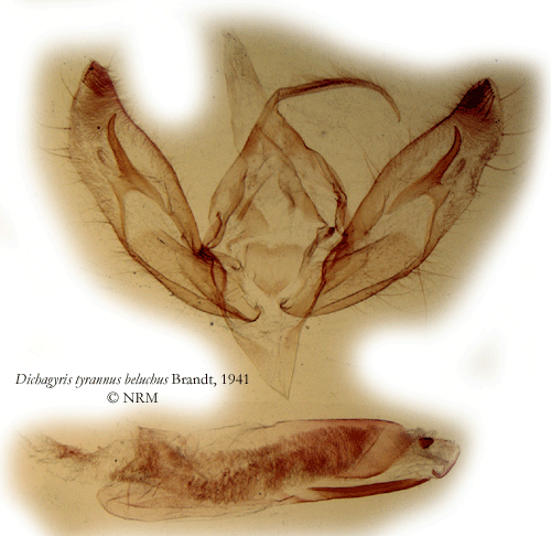 Dichagyris tyrannus beluchus Brandt, 1941. Reference: Brandt, W. 1941, Beitrag zur Lepidopteren-Fauna von Iran (3). Neue Agrotiden, nebst Faunenverzeichnissen. - Mitteilungen der Münchner Entomologischen Gesellschaft 31, München. pp. 835-863. Return to species-list. |