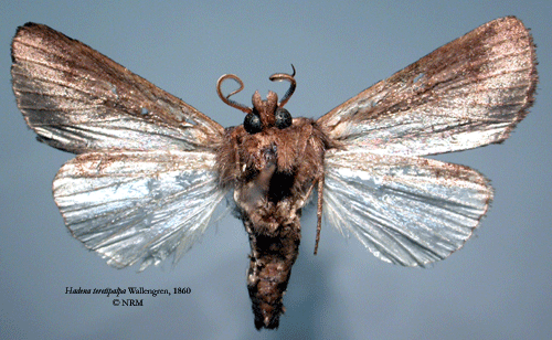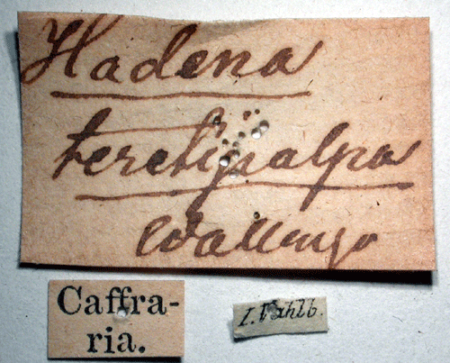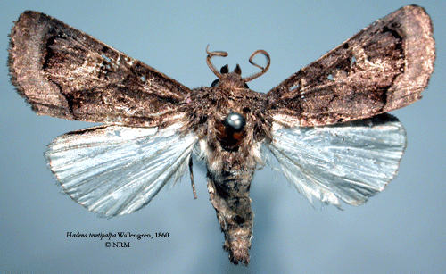 ![]() Hadena teretipalpa Wallengren, 1860. Reference: Wallengren, H.D.J. 1860, Lepidopterologische Mittheilungen. - Wiener Entomologische Monatschrift Band IV Nr. 6, Karl Ueberreuter, Alservorstadt. pp 161-176. Return to species-list. |