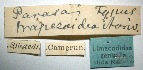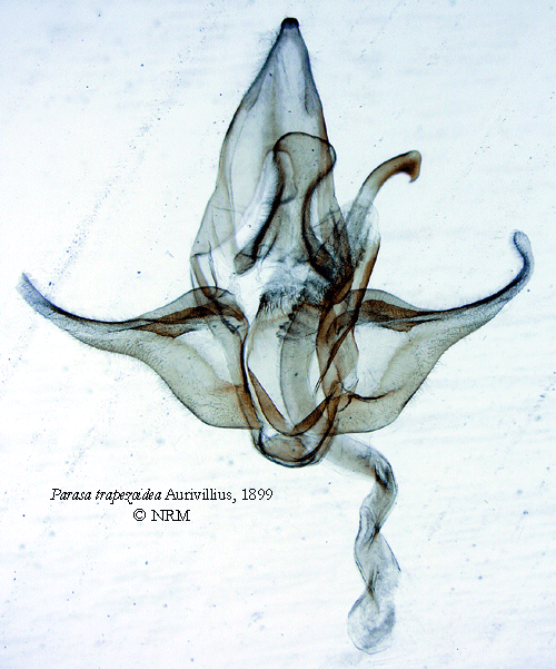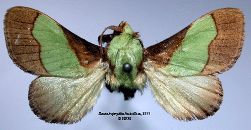 Parasa trapezoidea Aurivillius, 1899. Reference: Aurivillius, C. 1899, Diagnosen neuer Lepidopteren aus Afrika 5. - Entomologisk tidskrift vol 20, Iduns Kongl. Hofboktryckeri, Stockholm. pp. 233-258. Return to species-list. |