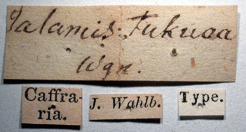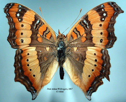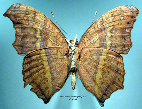 ![]() Salamis tukuoa Wallengren, 1857. Reference: Wallengren, H.D.J. 1857, Kafferlandets Dagfjärilar, insamlade åren 1838-1845 af J. A. Wahlberg. - Kongliga Vatenskaps-Akademiens Handllingar, ny följd, andra bandet fjärde häftet. pp 1-55, P. A. Norstedt & Söner, Stockholm. Return to species-list. |