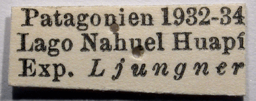 Reference: Bryk, F. 1944, Über die Schmetterlingsausbeute der Schwedischen wissenschaftlichen Expedition nach Patagonien 1932/1934. Report Number 11 from the Ljungner Expedition 1932/1934. Mit 2 Tafeln. - Arkiv för Zoologi Band 36 A nr. 3, Almqvist & Wiksell Boktryckeri, Uppsala. 1 - 30 pp.