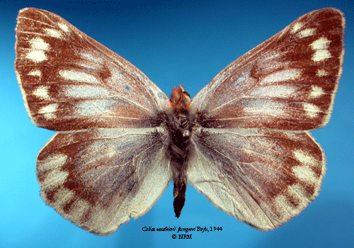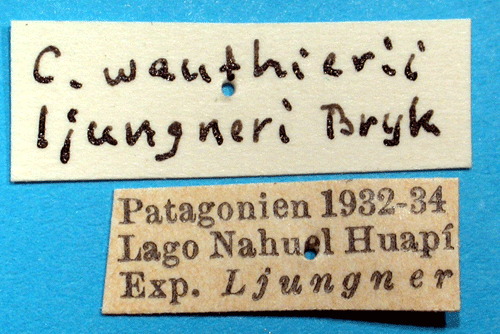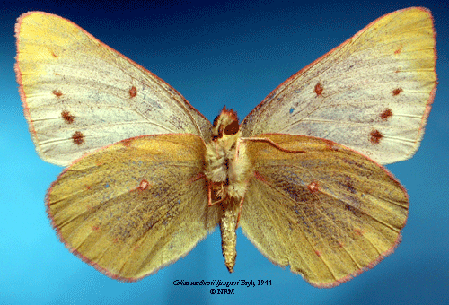 ![]() Colias vauthierii ljungneri Bryk, 1944. Reference: Bryk, F. 1944, Über die Schmetterlingsausbeute der Schwedischen wissenschaftlichen Expedition nach Patagonien 1932/1934. Report Number 11 from the Ljungner Expedition 1932/1934. Mit 2 Tafeln. - Arkiv för Zoologi Band 36 A nr. 3, Almqvist & Wiksell Boktryckeri, Uppsala. 1 - 30 pp. Return to species-list. |