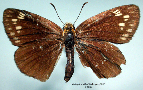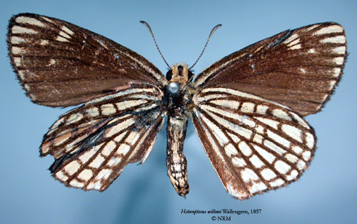 ![]() Heteropterus willemi Wallengren, 1857. Reference: Wallengren, H.D.J. 1857, Kafferlandets Dagfjärilar, insamlade åren 1838-1845 af J. A. Wahlberg. - Kongliga Vatenskaps-Akademiens Handllingar, ny följd, andra bandet fjärde häftet. pp 1-55, P. A. Norstedt & Söner, Stockholm. Return to species-list. |
