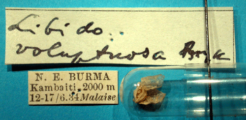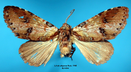 ![]() Libido voluptuosa Bryk, 1949. Reference: Bryk, F. 1949, Entomological Results from the Swedish Expedition 1934 to Burma and British India. Lepidoptera: Notodontidae Stephens, Cossidae Newman and Hepialidae Stephens. Gesammelt von René Malaise. Mit 4 Tafeln und 1 Karte in Text. - Arkiv för Zoologi Band 42 A nr. 19, Almqvist & Wiksell Boktryckeri, Uppsala. 1 - 51 pp. Return to species-list. |