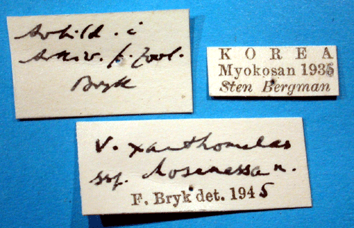 Reference: Bryk, F. 1946, Zur Kenntnis der Großschmetterlinge von Korea. Pars I. Rhopalocera, Hesperiodea et Macrofrenatae I Sphingidae. Mit 5 Tafeln und 1 Karte. - Arkiv för Zoologi Band 38 A nr. 3, Almqvist & Wiksell Boktryckeri, Uppsala. 1 - 74 pp.