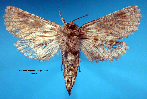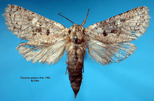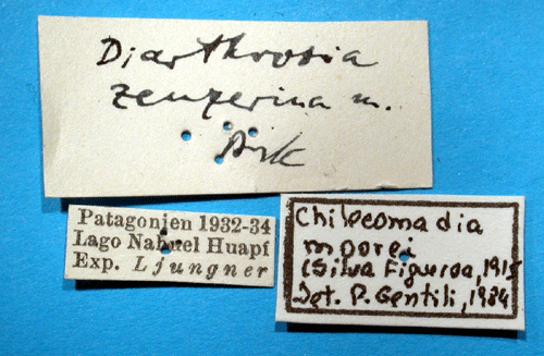 ![]() Diarthrosia zeuzerina Bryk, 1944. Reference: Bryk, F. 1944, Über die Schmetterlingsausbeute der Schwedischen wissenschaftlichen Expedition nach Patagonien 1932/1934. Report Number 11 from the Ljungner Expedition 1932/1934. Mit 2 Tafeln. - Arkiv för Zoologi Band 36 A nr. 3, Almqvist & Wiksell Boktryckeri, Uppsala. 1 - 30 pp. Return to species-list. |